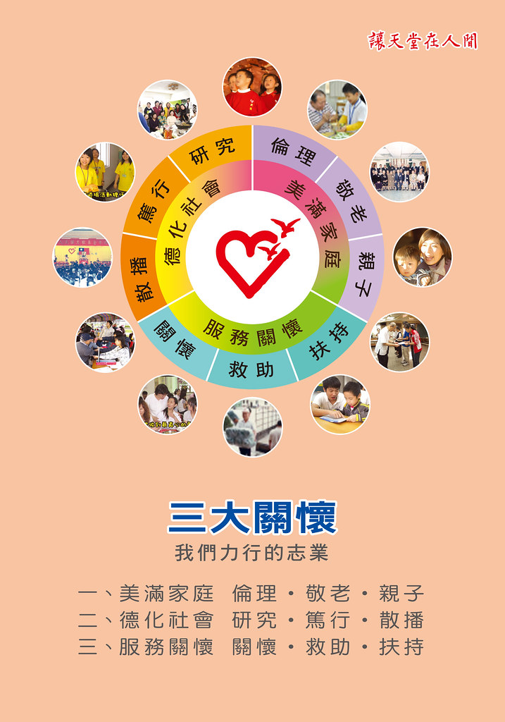 三大關懷 一、美滿家庭 倫理‧敬老 ‧親子 推動敬老、親子、挽化瓦解中的當今家庭倫理。 二、德化社會 研究‧ 篤行‧ 散播 喚醒大眾研究社會需求,推動道德文化落實於生活之中。 三、 服務關懷 關懷‧ 救助 ‧扶持 急難救助,孤老救助,獎助學金。 以三大實際行動投入 兒童讀經教育推廣-闡揚品德教育充實孩子成長的根本弱勢兒童關懷-弭補瓦解中社會與國家的根本環保素食 搶救溫室效應-搶救我們的明天